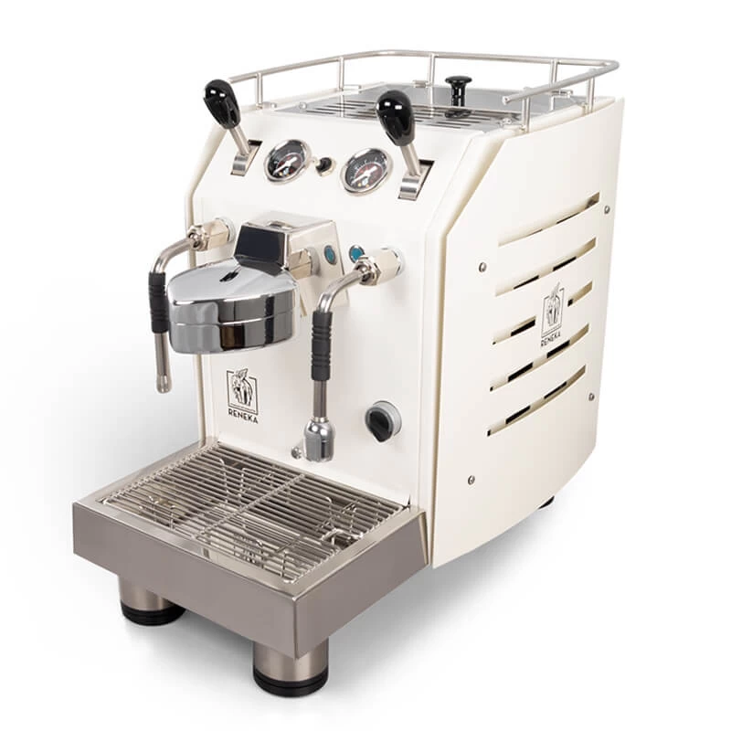 Die Reneka Family Home 1G ist eine wirklich einzigartige Siebträgermaschine, die sich in einigen Punkten von vergleichbaren Maschinen absetzt. Zunächst fällt ihr edles Design, entworfen von Alexander Schulz, ins Auge. Die aufgesetzten Seitenpanels, die großen Füße und vor allem die Hebel und Manometer an der abgeschrägten Bedienleiste hinterlassen einen prestigeträchtigen Eindruck. Besonders die Hebel und Instrumente im Zusammenspiel mit der Reling an der Tassenablage erinnern an eine Motoryacht. Die große technische Besonderheit liegt jedoch in der Aroma-Perfect-Brühgruppe mit automatischem Tamping.