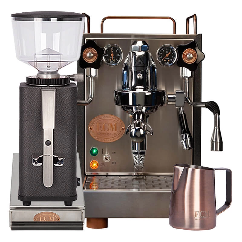 Dieses Bundle ist durch die Heritage Linie ein ganz besonderer Hingucker für Heimbaristas. Im edlen Kupfer Look bekommen Sie die ECM Mechanika VI Slim, die ECM S-Manuale 64, sowie das passende Zubehör von ECM in Form einer Sudschublade und eines Milchkännchens.
