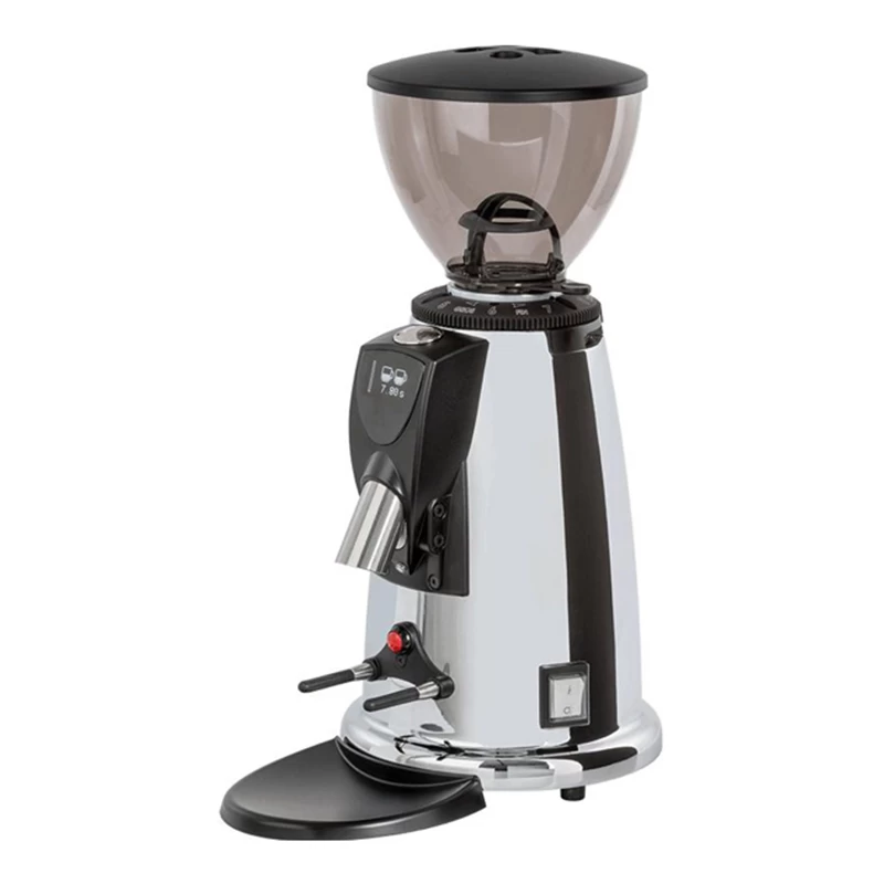 Die M42D R Espressomühle von Macap verfügt über einen digitalen Timer, mit dem die zu mahlende Menge auf eine zehntel Sekunde genau bestimmt werden kann. Diese Funktion kann für den Bezug von ein, bzw. zwei Portionen individuell programmiert werden. Ein manueller Mahlmodus steht ebenso zur Verfügung. Der Bezug des Kaffeemehls erfolgt direkt in den Siebträger. Der Bohnenbehälter ist getönt, um schädliche Sonnenstrahlen von den wertvollen Bohnen abzuschirmen und fasst bis zu 500 g Espressobohnen.